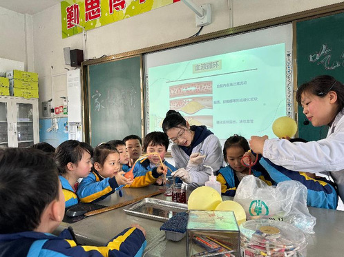 课堂上,刘老师以“垃圾食品”为切入点,通过讲解肥胖的危害带领同学们感受身体健康的重要性。在血液循环实验环节,同学们积极参与、踊跃提问,曾文卓老师引导小学生们自己动手操作,既锻炼了他们的动手能力,又巩固了他们的科学知识,现场气氛活跃。