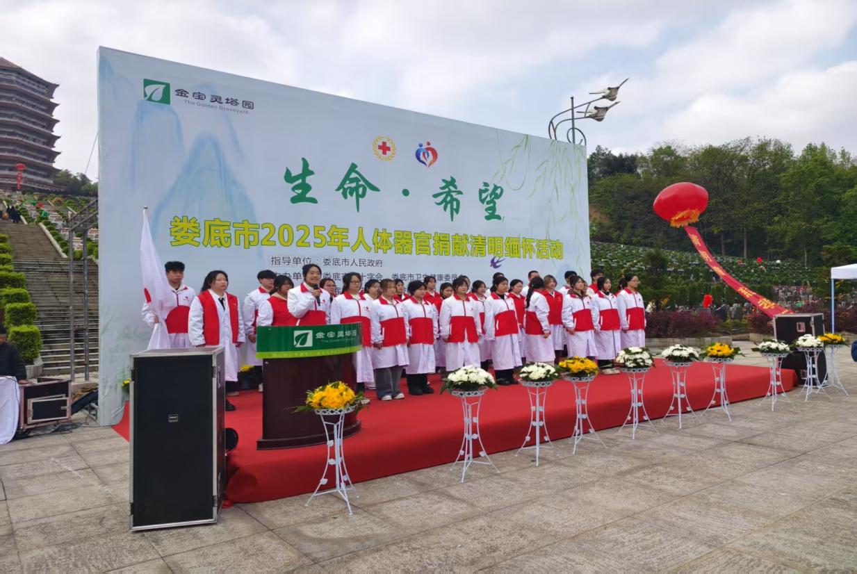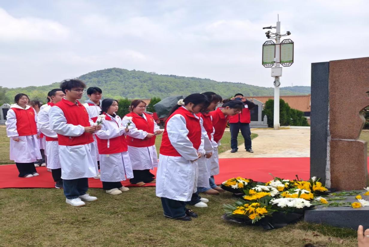 春寒料峭的清明前夕,娄底职业技术学院医学部联合市红十字会等单位,在金宝灵塔园举办“生命·希望——2025年娄底市遗体捐献缅怀纪念活动”,活动搭建起跨越生死的对话平台,融入医学人文、课程思政的理念,开展生命文化教育,传递“生命延续、大爱永恒”的力量 。本次活动由医学部常务副主任范国正、基础医学院院长刘永堂带队,生命科学教研室全体老师、医学部团委、解剖课外兴趣活动组、人体生命科学科普志愿服务队和捐献者家属代表共55人参加。
