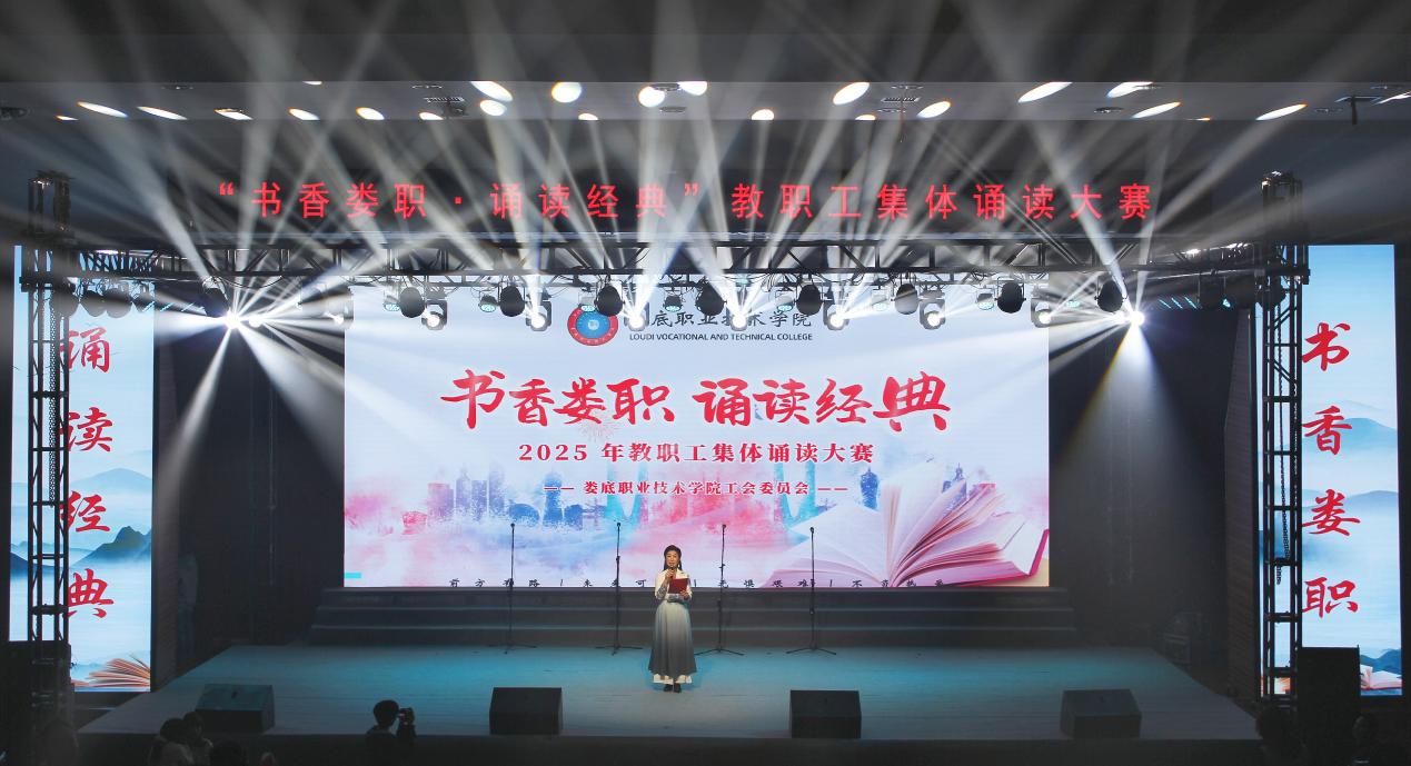 根深者叶茂,源浚者流长。为隆重庆祝中华全国总工会成立100周年,进一步激励和动员全校广大教职员工更加紧密团结在以习近平同志为核心的党中央周围,进一步加强教职工队伍思想政治建设,弘扬中华传统文化,引领广大教职工坚定不移听党话,矢志不渝跟党走,2025年10月23日,我校在新培训楼学术报告厅举办“书香娄职•诵读经典”教职工集体诵读大赛。