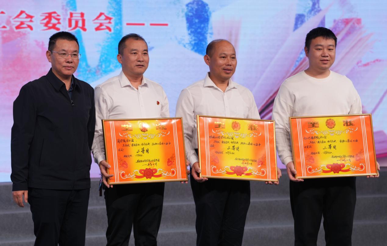 最终,经过公平评审,人事、工会、学保团联合队的《密码》,组宣网、党政办、招财基产联合队的《永远的旗帜》,建筑工程学院分工会《建筑人的少年中国说》荣获一等奖;文化传播学院分工会的《百年交响》,农林工程学院分工会的《我骄傲,我是中国人》,商学院分工会的《弦歌不辍•匠心百年》获得二等奖;汽车学院分工会的《红船》,艺术设计学院分工会的《我的祖国》,机电工程学院分工会的《赤壁赋》获得三等奖。周志和为获奖者颁奖并合影。