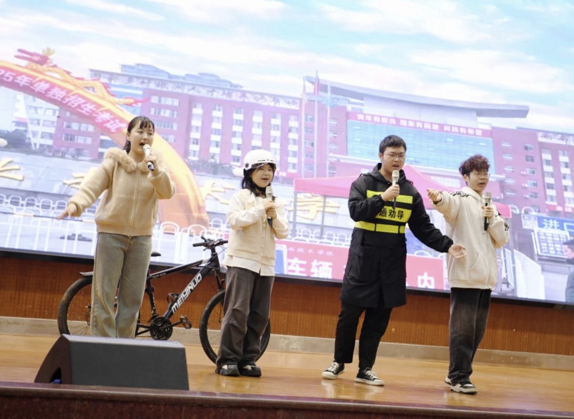 活动在形式多样的环节中依次展开。由同学们自编自演的情景话剧《校门口的“安全课”》和《头盔不亏》率先登场。话剧生动再现了骑行电动自行车不佩戴头盔、随意横穿马路等校园周边常见的交通违规行为,直观展现了这些行为可能带来的严重后果。贴近校园生活的剧情和同学们投入的表演,引发了现场观众的强烈共鸣,在轻松的氛围中敲响了安全警钟。