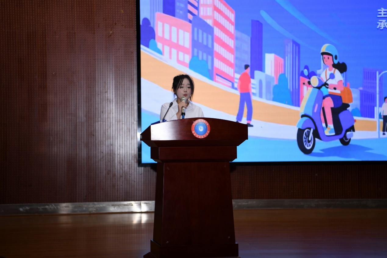 随后的主题宣讲与文艺表演环节活动更是精彩纷呈。活动伊始,校团委书记石磊发表致辞。他强调,交通安全是校园和谐稳定的重要基础,也是青年学生成长成才的基本保障。他指出,大学生作为社会文明的先锋力量,应自觉成为文明交通的践行者、传播者和守护者,从自身做起,带动身边同学共同维护良好交通秩序。石书记表示,学校将持续加强与交警等部门的联动,常态化开展交通安全教育活动,共同为学生的安全出行保驾护航。