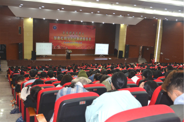11月16日,“全国优秀大学生”邹勇松同学先进事迹报告会在我校新培训楼举行,我校党委委员、副校长周志和,长沙理工大学计算机与通信工程学院党委副书记兼副院长陈华,我校团委书记刘媛,学生工作处处长李规,学工处副处长阳娟、肖靓,全国优秀大学生邹勇松及邹勇松同学先进事迹报告团成员出席。我校各二级学院学工副院长、辅导员和学生代表聆听报告。