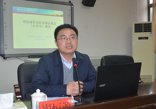12月6日,省委教育工委宣传部副调研员崔恒源来校为全体辅导员作题为“高校辅导员队伍建设规定(43号令)解读”讲座,党委委员、副校长周志和,学工处处长李规,团委书记刘媛,学工处副处长阳娟、肖靓及二级学院学工院长、全体辅导员参加了讲座,讲座由李规主持。