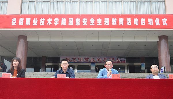4月10日,我校在文化广场举行2019年学生国家安全主题教育活动启动仪式。校党委委员、副校长周志和,学生工作处处长李规,校团委书记刘媛,校保卫处副处长伍琳在主席台就坐,学工处相关工作人员、各二级学院学工副院长、辅导员、17、18级全体学生参加。活动由李规主持。