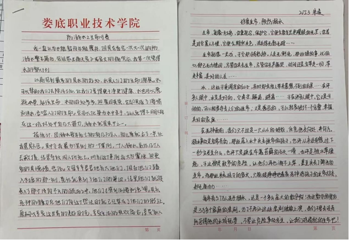 学校通过校园宣传栏、易班、微信公众平台等多媒体渠道进行防溺水教育宣传,各班级辅导员通过家长微信群宣传防溺水教育,发布“防溺水致家长一封信”,向家长传达防溺水安全知识教育知识,增强监护人安全意识和责任意识,让每一位家长切实了解自己应担负的监护责任,对孩子行踪要做到“四知”:知去向、知归时、知同伴、知内容。同时组织学生开展防溺水征文活动、手抄报活动,切实提高学生防溺水安全防范意识,营造浓厚的安全教育氛围。