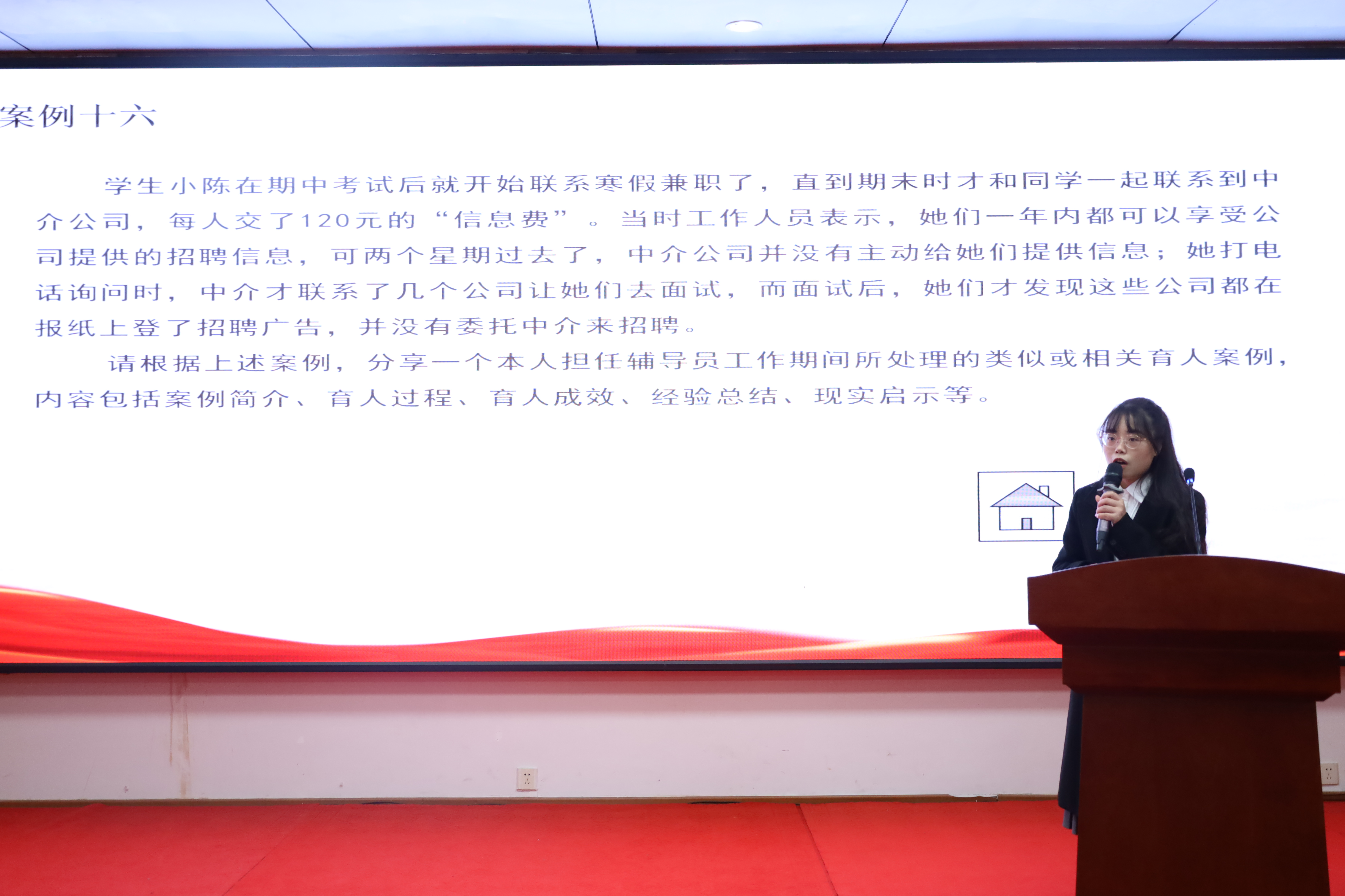 复赛进行的是育人案例分享,主要考查辅导员的表达能力、案例分析总结能力以及研判问题、解决问题和应急处突能力。参赛辅导员赛前抽取出场顺序,出场前抽取一个育人案例,根据所抽案例从做为辅导员角度如何处理该案例进行分享,内容包括案例简介、育人过程、育人成效、经验总结、现实启示等。