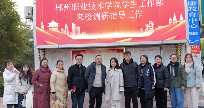 为加强两校之间的交流与合作,共同探讨学生管理工作的创新与发展,12月25日下午,郴州职业技术学院学生工作处处长谢苏闽率队一行6人莅临我校考察交流学生管理工作,学校学生工作处处长李规,副处长邱玉贵、肖靓、阳帆,资助中心主任黄娟等热情接待并陪同考察交流。