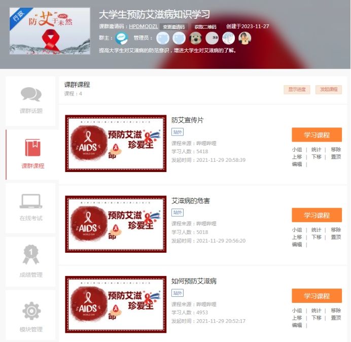学校还通过易班优课建立了大学生防艾知识学习课程,邀请同学们加入优课课群学习相关课程,完成大学生防艾教育及知识考试,进一步增强同学们对艾滋病防治的认识,提高防艾意识。