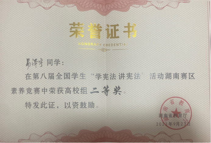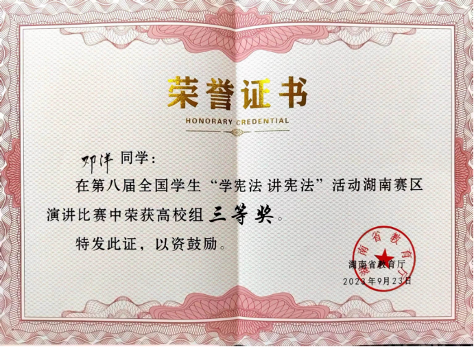 9月24日,第八届全国学生“学宪法 讲宪法”活动湖南赛区高校组总决赛在湘潭大学举行,我校学子喜获二等奖、三等奖各一项,这也是我校首次在“学宪法 讲宪法”活动总决赛中获奖。