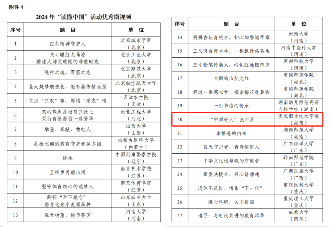 近日,由教育部关心下一代工作委员会主办的2024年“读懂中国”活动圆满落幕,我校学生工作处组织拍摄的微视频作品《“中国好人”张四英》在全国众多参赛作品中脱颖而出,被评为优秀微视频,我校被评为2024 年“读懂中国”活动表扬单位。