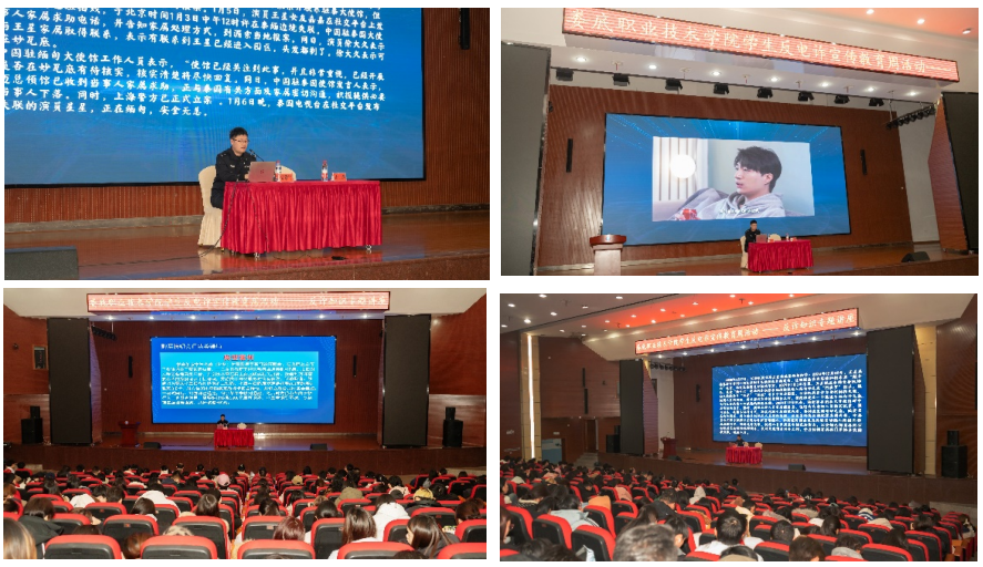 学校在教学楼、运动场、宿舍等人流密集区域的电子显示屏滚动播放反诈宣传短片;在校园的图文展板展示“十个凡是”“ 六个一律”等防诈口诀;学生工作处连续数周发布学生反诈安全温馨提示;保卫处通报群众电诈受骗案例警醒学生;在校园广播播报反诈提醒,让反诈知识“入眼入耳更入心”。