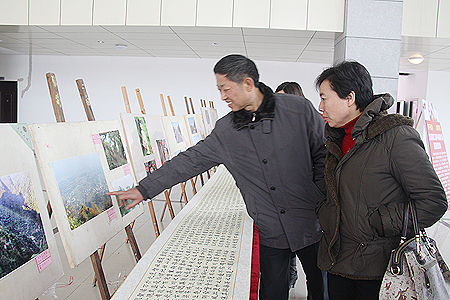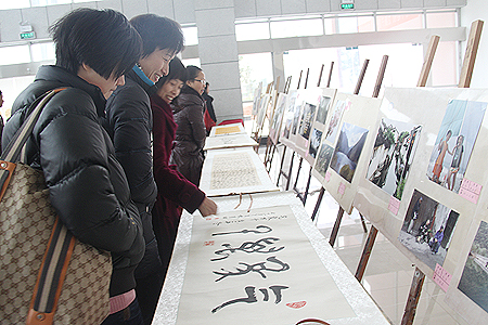 1月4日,娄底职院教职工迎新年书画摄影展暨写福送春联活动在培训大楼大厅举行。此次活动由院工会主办、院书法摄影协会承办,积极响应十七届六中全会推动社会主义文化大发展大繁荣的精神,以书画摄影作品展示形式表达学院教职员工的精神文化追求,展示广大教职员工的艺术才华和学院团结和谐、奋发向上、爱岗敬业的精神风貌。活动以“骨干起航 龙腾开局”为主题,共收到全院教职工100余幅书法、绘画、摄影作品。我院领导颜彩飞、曾国基、李天仁均向活动赠送了书法作品,著名校友、娄底书画界名人也纷纷向活动赠送作品,以示支持。