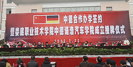 3月22日上午,中德合作办学签约暨娄底职业技术学院中德诺浩汽车学院授牌仪式在院文化广场隆重举行。这是我院首次开展国际合作办学,培养具有国际视野的高技能型人才。在国家、省、市有关部门领导、全院师生的见证下,我院中德诺浩汽车学院宣告成立。