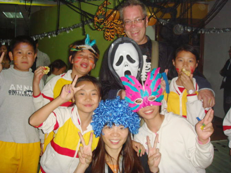 ![]() 易思奇(中)与学生、外教在一起