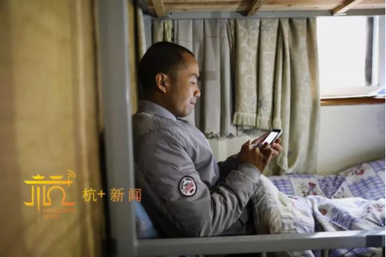 (雷海为在自己的出租房铺位上用手机读诗背诗)