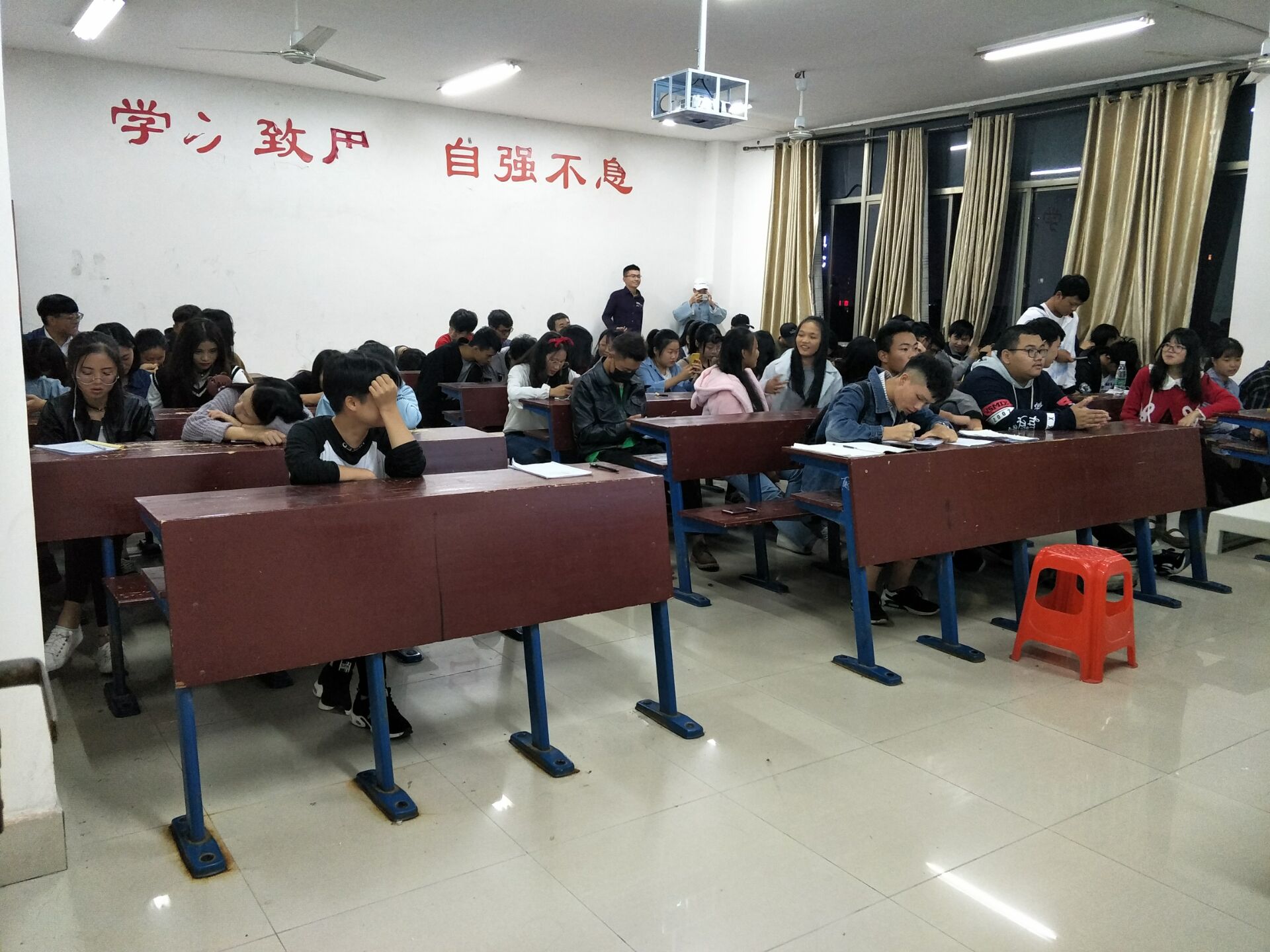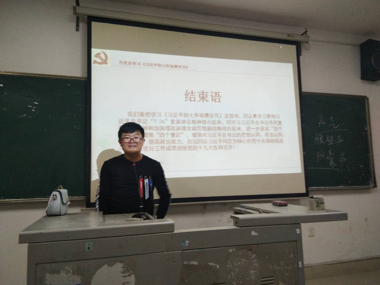 2017年10月22日晚艺术设计学院全院学生在主教楼五楼分班开展关于习近平七年知青岁月的主题班会,由主讲人引导大家走进19大,观看19大坚定推进“两学一做”和“四讲四爱”学习教育常态化、制度化、鼓励支教团队员们在学习中联系实际、深入思考。真正做到学思践悟、学用结合。