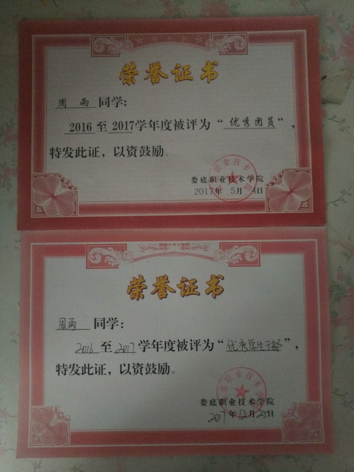周雨所获得的证书