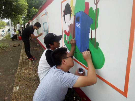 上午志愿者们对墙体进行了仔细测量和规划,研究各个图形的大小和位置,以及开始初步绘画草图,便于直观而清晰的了解本次墙绘的效果图。