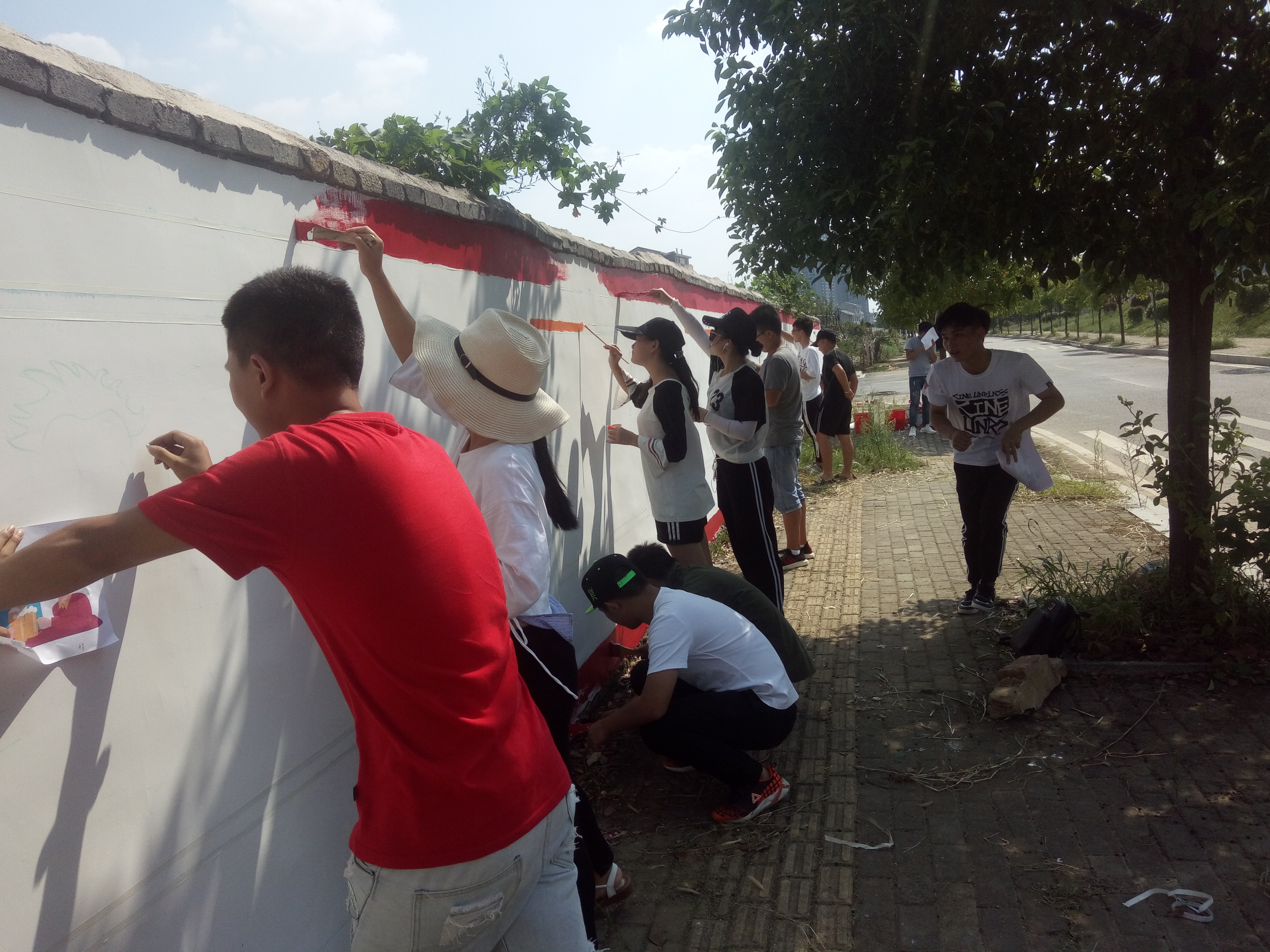 下午志愿者们都开始准备实际操作,虽然天气炎热,但是志愿者们的行动激情,却丝毫没有减少,纷纷在墙面上开始了边框和大致格子的打形和上色。