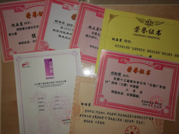 胡海霞,17艺术设计一班团支书,学习努力,工作认真,积极参加各种活动,在校表现情况优异,获得众多荣耀。在2017年,荣获第五届文化艺术节“我的中国风”绘画大赛优胜奖;2018年1月份,第五届文化艺术节之中华经典诗文朗诵大赛中,获得优胜奖;2018年5月份在第十三届青年学习节“公益广告设计”活动中获二等奖;同期与两名同学,一起荣获湖南省第六届网络文化节“最美板书传三湘”主题活动学“习”黑板报三等奖;同月获得艺术设计学院“弘扬传统艺术,提高文化自信”宣讲比赛中,荣获优胜奖;2018年7月份在艺术设计学院,2018年毕业晚会上表现突出,被评为优秀演员;荣获2018年第十届全国大学生广告艺术大赛,湖南赛区优胜奖。