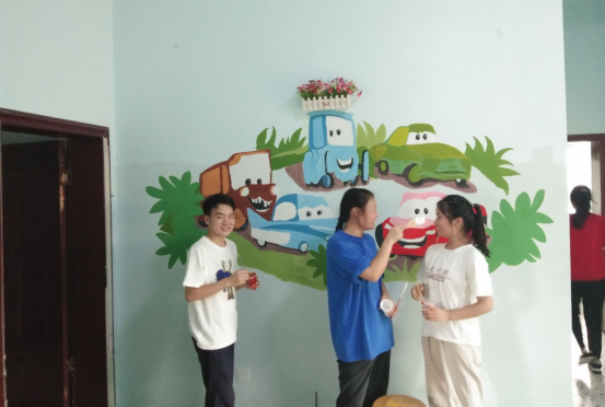 此次社会实践活动增强了学生们的社会责任感和使命感。该团队一共由21名同学组成,一部分同学带孩子们玩游戏、唱歌、剪纸等小活动,另一部分同学为孩子们居住的地方添加异彩,欢声笑语和一幅幅卡通壁画将孩子们带入了温馨的童话世界,虽然他们身体有着缺陷,但他们的内心可爱单纯,整个现场变成了爱的海洋,在这份超越身体的界限和年龄的爱里,志愿者们真正融入到了这一可爱又特殊的小群体中。两天时间绘画出9面壁画,同时也得到领导的称赞与认可。