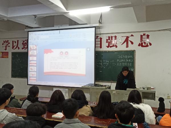 团支书为大家介绍习近平近期发表的“新时代中国特色社会主义”的新的观点和新言论。带领同学们认识新的知识。郑重的介绍了把习近平新时代中国特色社会主义思想载入宪法,实现了国家指导思想的与时俱进,反映了全国各族人民共同意志和全社会共同意愿。
