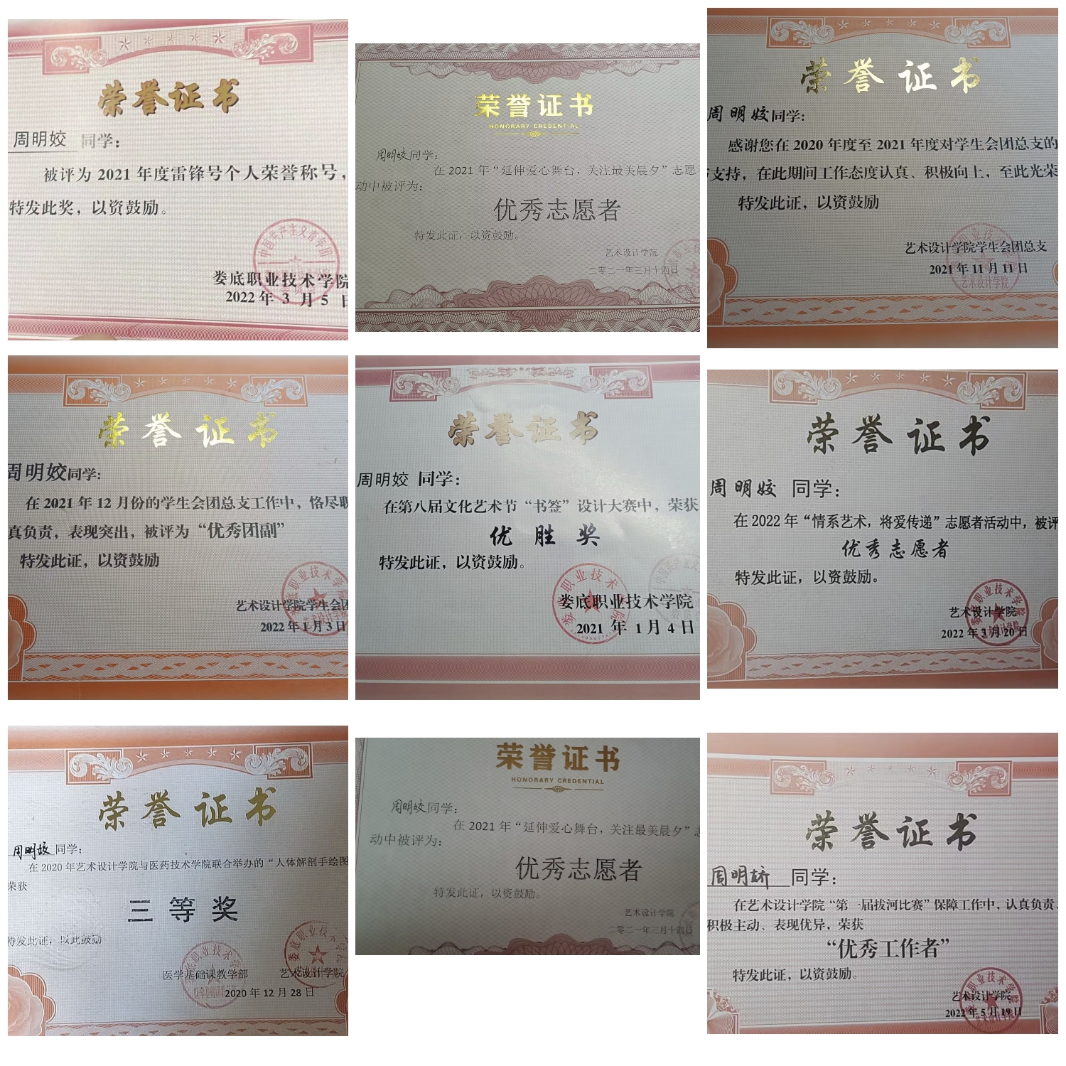 周明姣来自艺术设计学院20VR二班,在班上担任女生委员一职,在院学生会担任第五届学生会团总支副书记一职。曾在2020年度艺术设计学院与医药技术学院联合举办的“人体解剖手绘图大赛”中荣获三等奖,参加2022年度“情系艺术,将爱传递”志愿者活动,作为志愿者前往敬老院看望老人,为老人们送去温暖,积极参加学院手工义卖,学习雷锋和组织核酸工作等志愿活动,被多次评为“优秀志愿者”称号。