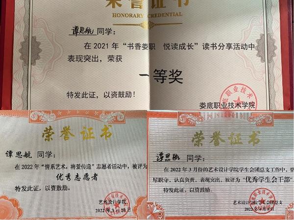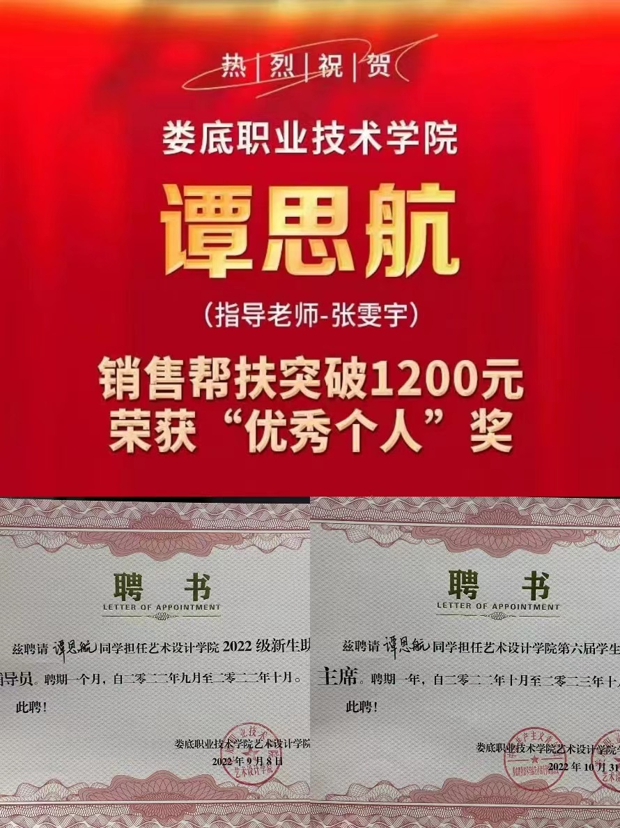 谭思航,2021级环艺2班班长,艺术设计学院第六届学生会主席。在学习上,他勤奋好学,自制力强,能够合理安排学习时间,善于思考积极回答问题,大一期间获得了书香娄职一等奖,严格遵循学校规章制度;在工作上,他勤勤恳恳,尊敬师长团结同学,有较强的领导能力,责任心强,心系学生会大局,看问题站在学校层面思考,正是因为他的格局,在平时严于律己宽以待人,被评为院优秀学生干部,国家励志奖学金的获得者。在生活上,他充实自己,积极参与班级和学校活动,获得校级优秀志愿者和扶贫营销大赛优秀个人,他乐于助人,时时传递正能量是学生学习的楷模。