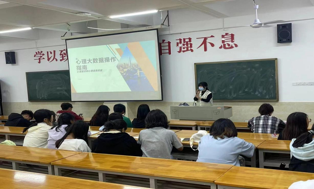 艺术设计学院心教部部长李逊哲在向各位同学开展如何利用心理大数据平台进行日常工作的培训。包括指导同学们点击进行心理评估、指导有需要的同学进行咨询预约、日常反馈上报等等。