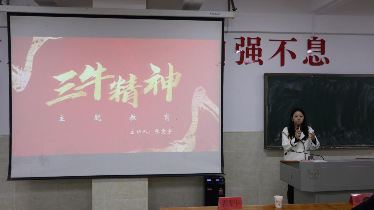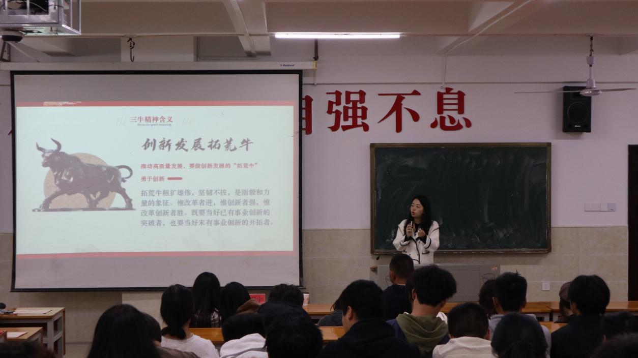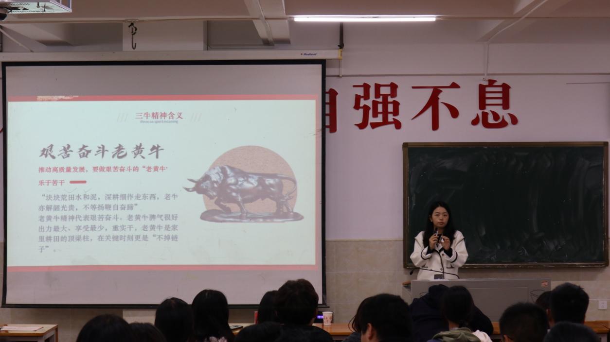 首先,张雯宇副院长跟我们讲解三牛精神背景的由来,“三牛”精神植根于中华民族优秀传统文化,蕴含着丰富的历史内涵。在大会提出,我们要发扬为民服务孺子牛、创新发展拓荒牛、艰苦奋斗老黄牛的精神。 孺子牛、拓荒牛、老黄牛,是砥砺奋进、创造历史的精神基因,更是披荆斩棘、创造未来的生动标识。