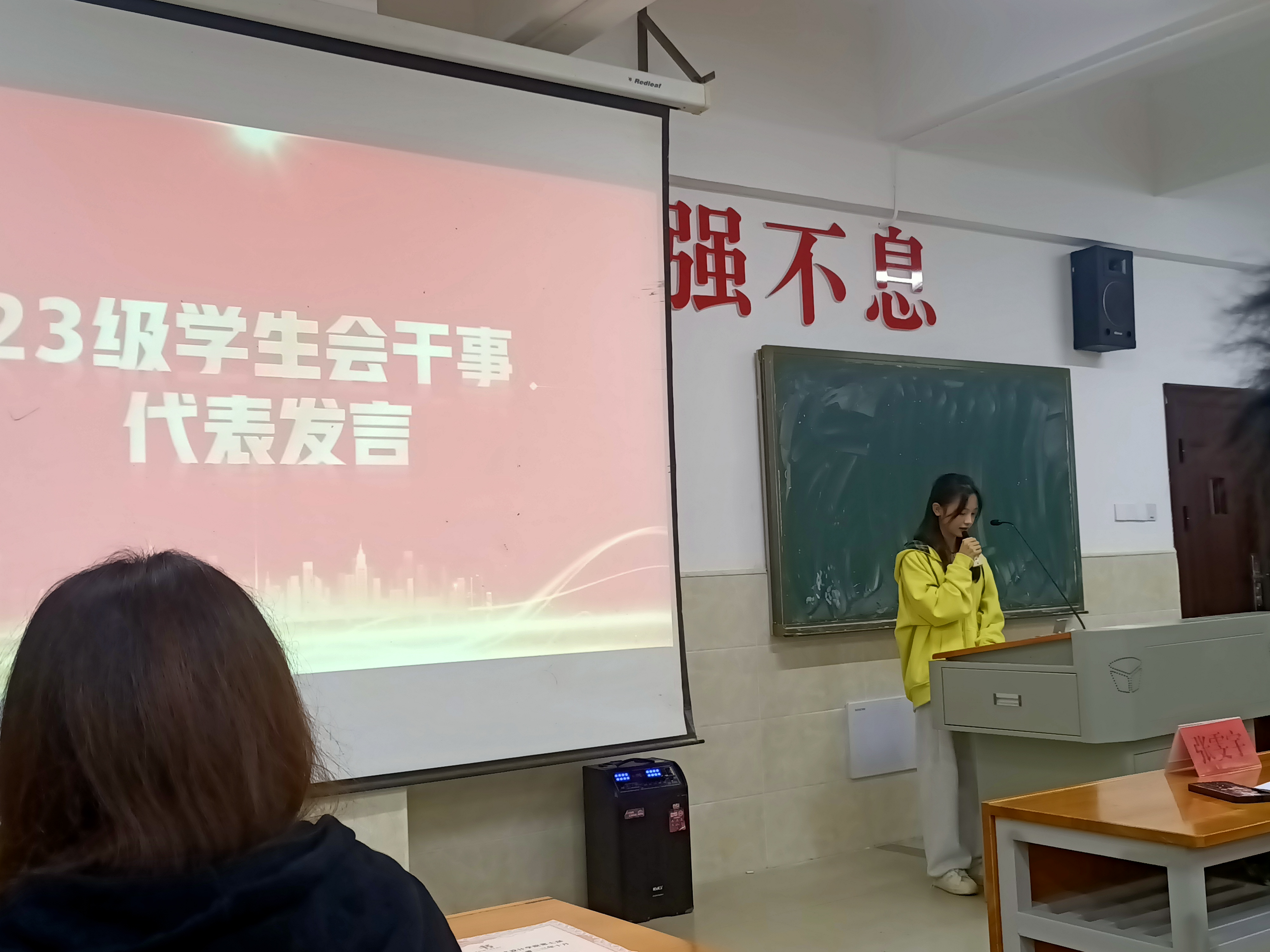 大会开始,由张雯宇副院长和邓梁老师为本次成功竞选学生自管会主要干部颁发聘书以及授牌,再由各部门部长为本次新生进行授牌,看着胸前闪闪发光的会牌,所有人心中都充满着骄傲,带上会牌,就代表了一份肩负的责任与信任。接下来由本次新生代表赵敏进行发言,讲到学生自管会是一个大家庭,要学会团结合作、共同进步,学习学长学姐的优点,赵敏同学的一番发言深深的感染到下面的学生。