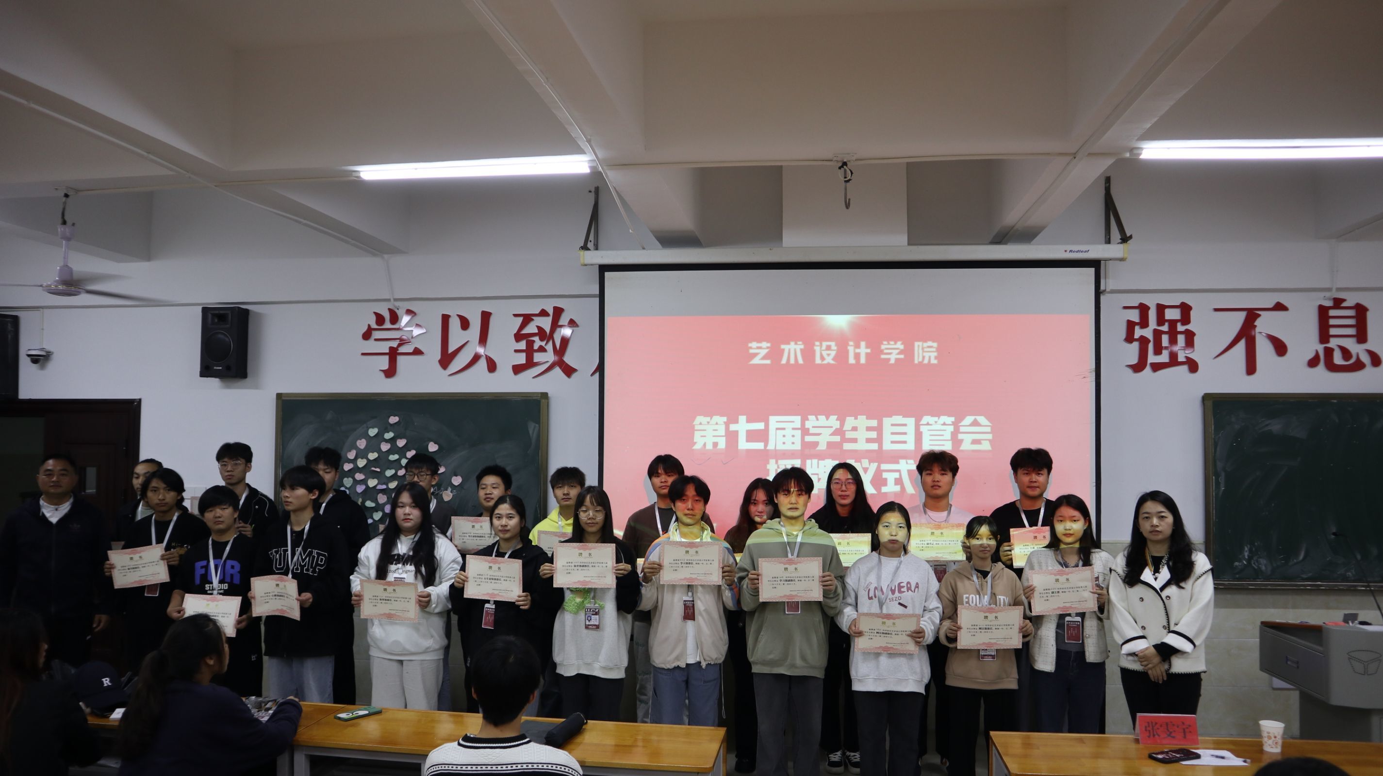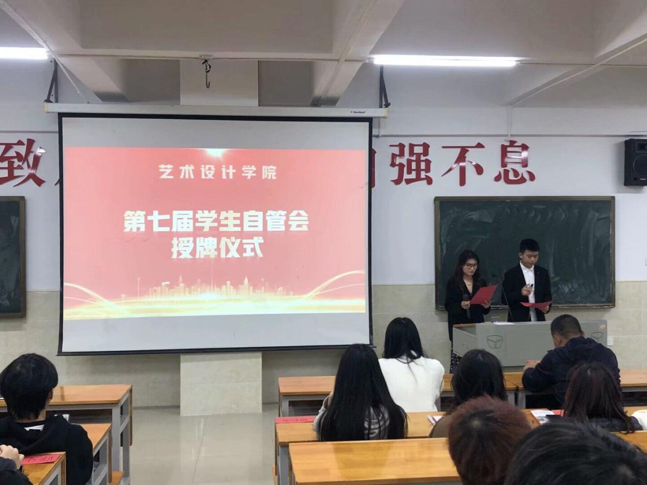 为了促进艺术设计学院各部门共同协作,更好地服务同学,2023年11月9号艺术设计学院学生自管会于主教楼210举办了授牌活动,参与本次会议的有学工副院长张雯宇、学工干事邓梁、辅导员李美娇、杨小蝶,本次大会的主持人是肖雅蝶、谭思航。