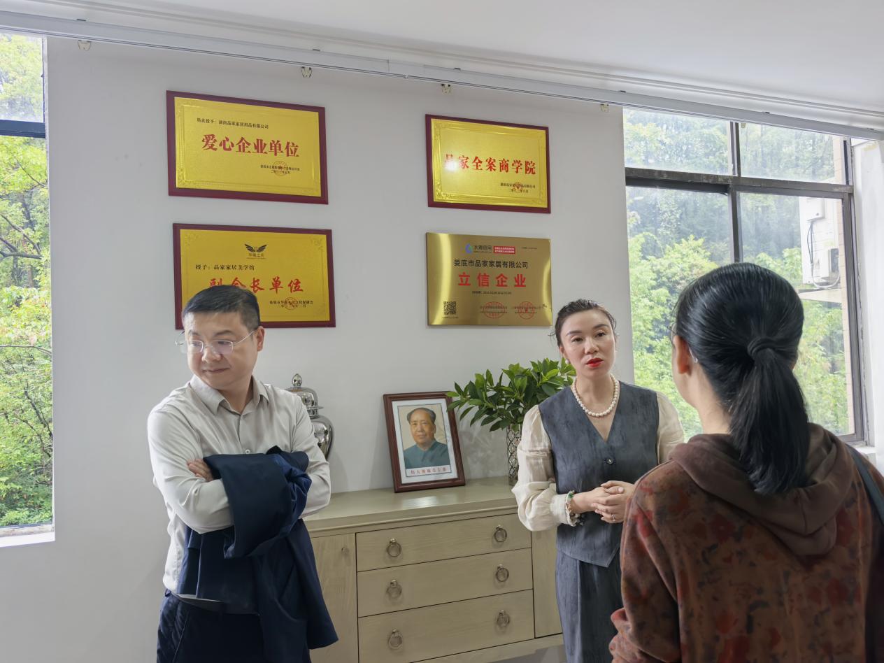 2024 年 10 月 16 日,为深入推进产教融合,开拓更多就业机会,娄底职院产教融合办晏然主任、艺术学院夏高彦院长、张雯宇副院长一同前往娄底品家家居公司进行参观考察。