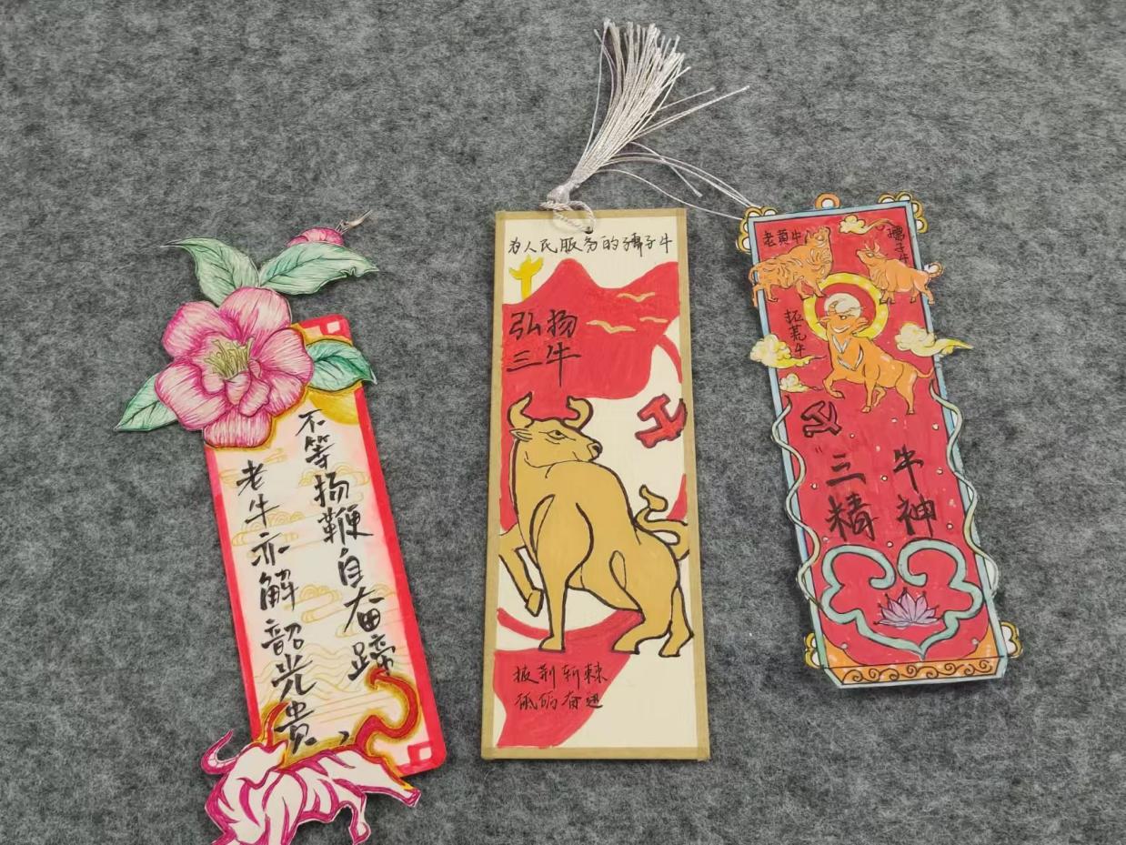 比赛期间,同学们都积极踊跃参与,将三牛精神与传统文化、校园生活、时代元素紧密结合,运用精湛的绘画、雕刻、手工技艺,融入对三牛精神“为民服务、无私奉献,创新发展、攻坚克难,艰苦奋斗、吃苦耐劳”内涵的深刻理解,精心设计出一系列精美且实用的书签作品,展现了新时代青年对传统精神的传承与创新。