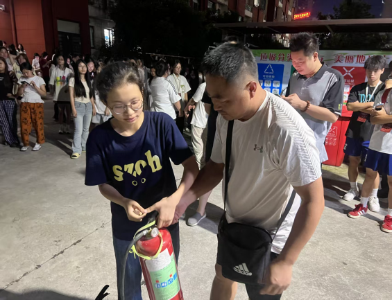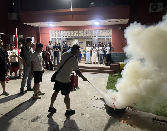 随后,邓梁组织并进行了实地灭火训练。对火灾类型、灭火器使用方法及逃生技巧,并指导学生亲手操作灭火器进行模拟灭火。通过“理论+实操”相结合的方式,让学生们进一步掌握了消防器材的使用方法和应急处置流程。