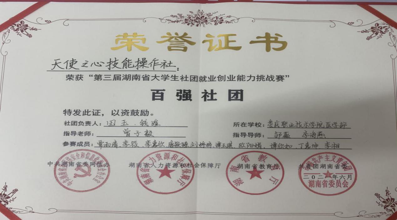 第三届湖南省大学生社团就业创业能力挑战赛是由湖南省委网信办、省人社厅、省教育厅和共青团湖南省委联合主办,以“青春就要放肆挑战”为主题,历时3个月,共吸引全省125所学校近2000家大学生社团30余万大学生参加。比赛启动以来,校团委积极响应,医学部团总支精心组织,派出学校共12个精英社团近700人参与此项比赛,每个社团都安排了相对应的指导老师。校团委及社团指导老师全程指导。最终由曾子毅、邹薇、李海燕老师指导的天使之心技能操作社从报名的近2000社团中脱颖而出,荣获2020年第三届湖南省大学生就业创业能力挑战赛"百强社团"的称号。