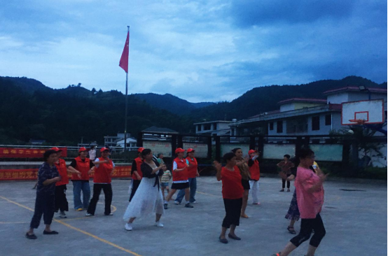 (图为志愿者们和村民一起跳广场舞)