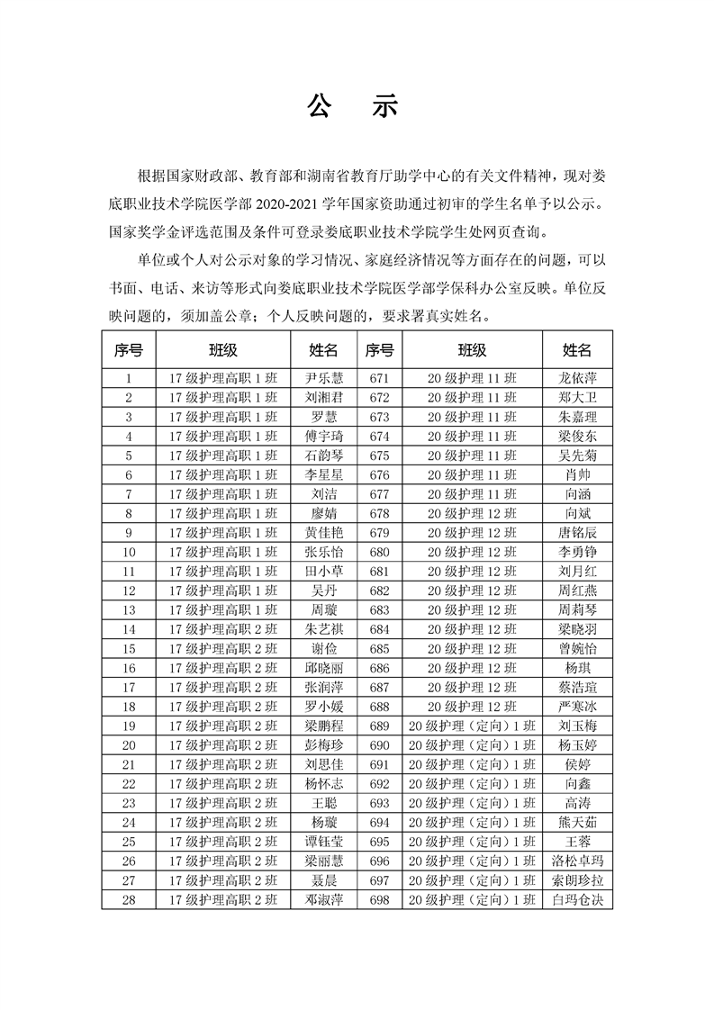 医学部国家助学金公示表