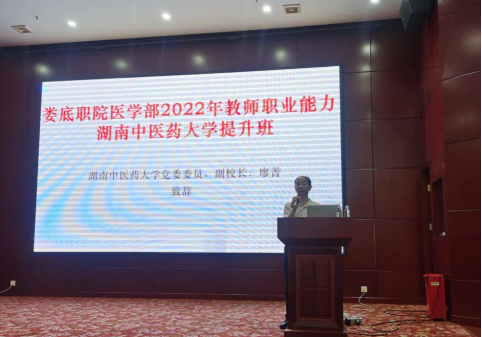 开班仪式上,湖南中医药大学党委委员、副校长廖菁致辞,对我院教师的到来表示欢迎,介绍了湖南中医药大学的办学情况,并预祝培训圆满成功。我校党委委员、副校长兼医学部主任金建雄对湖南中医药大学的热情接待表示感谢,并对参训教师提出培训要求:希望教师们放下杂事、集中心思,以空杯的心态、归零的态度,汲取专家们所传授的前沿知识和宝贵经验,通过学习和沉淀,不断提高教学能力和科研水平。