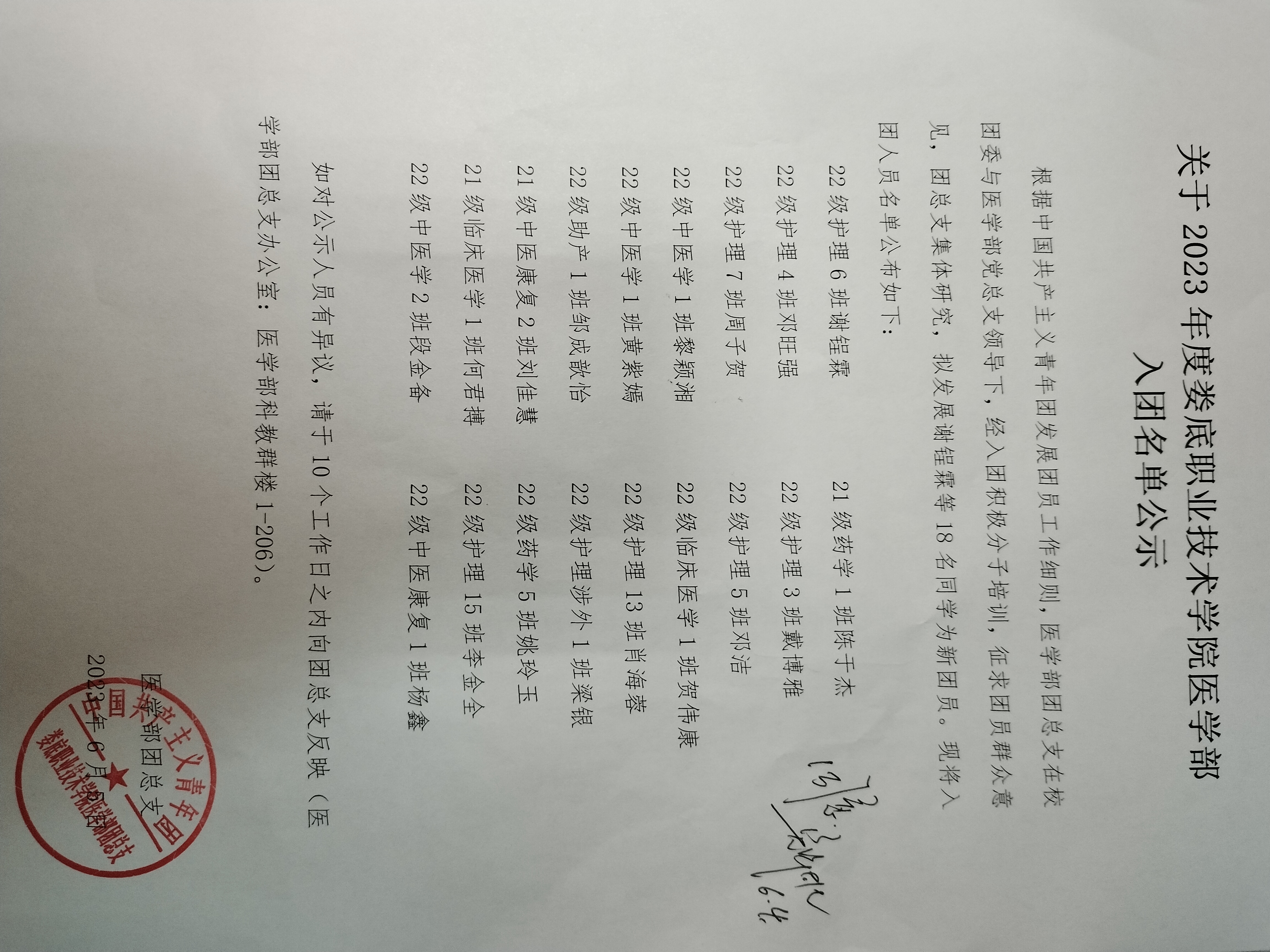 关于2023年度娄底职业技术学院医学部入团名单公示