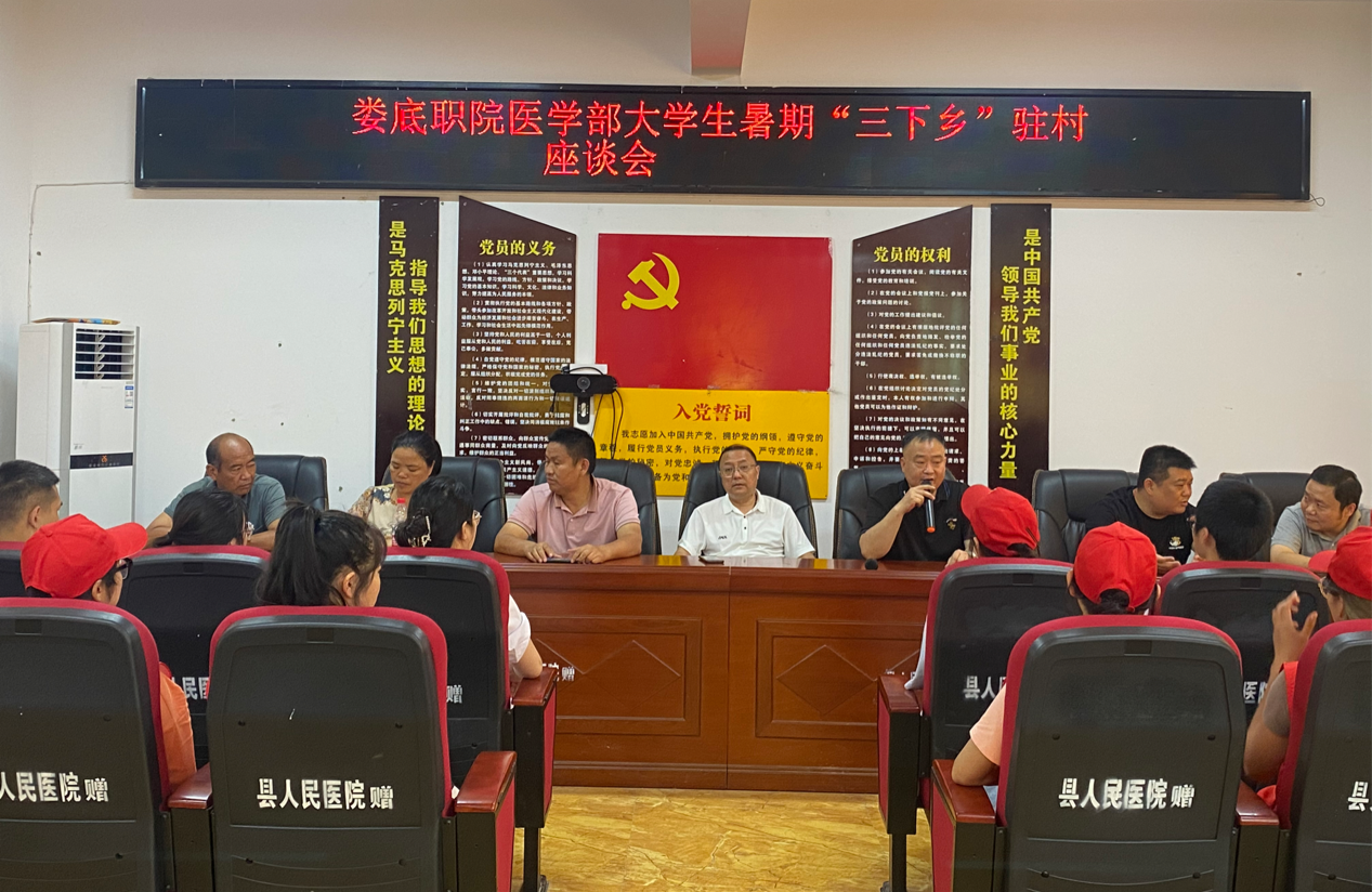 义诊结束后,医学部各领导与杨洪岩村支两委及“三下乡”团队所有成员开展了座谈会。会上,“三下乡”带队老师曾子毅对团队之前的工作进行了总结汇报。吴群雄就责任和收获两方面,鼓励学生们在接下来的工作中要更加扎实的完成。随后,杨洪岩村党总支书记黎光辉对志愿者们为杨洪岩村健康乡村建设的付出表示了感谢。最后曹雄辉再次对杨洪岩村村干部的配合与支持表示感谢,并预祝此次暑期“三下乡”的任务圆满完成。