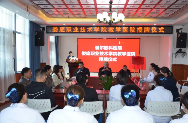 为进一步推动校企合作,深化产教融合,助推职业教育高质量发展,11月23日上午,娄底职业技术学院教学医院授牌仪式在娄底爱尔眼科医院会议室举行。娄底职业技术学院副校长金健雄、医学部常务副主任范国正、娄底爱尔眼科医院院长兼CEO廖华、医院副院长兼眼底专科主任唐玖鸿、医院副院长兼视光专科主任谭健、医学部相关负责人、医院相关工作人员、实习生代表共同出席了本次授牌仪式。
