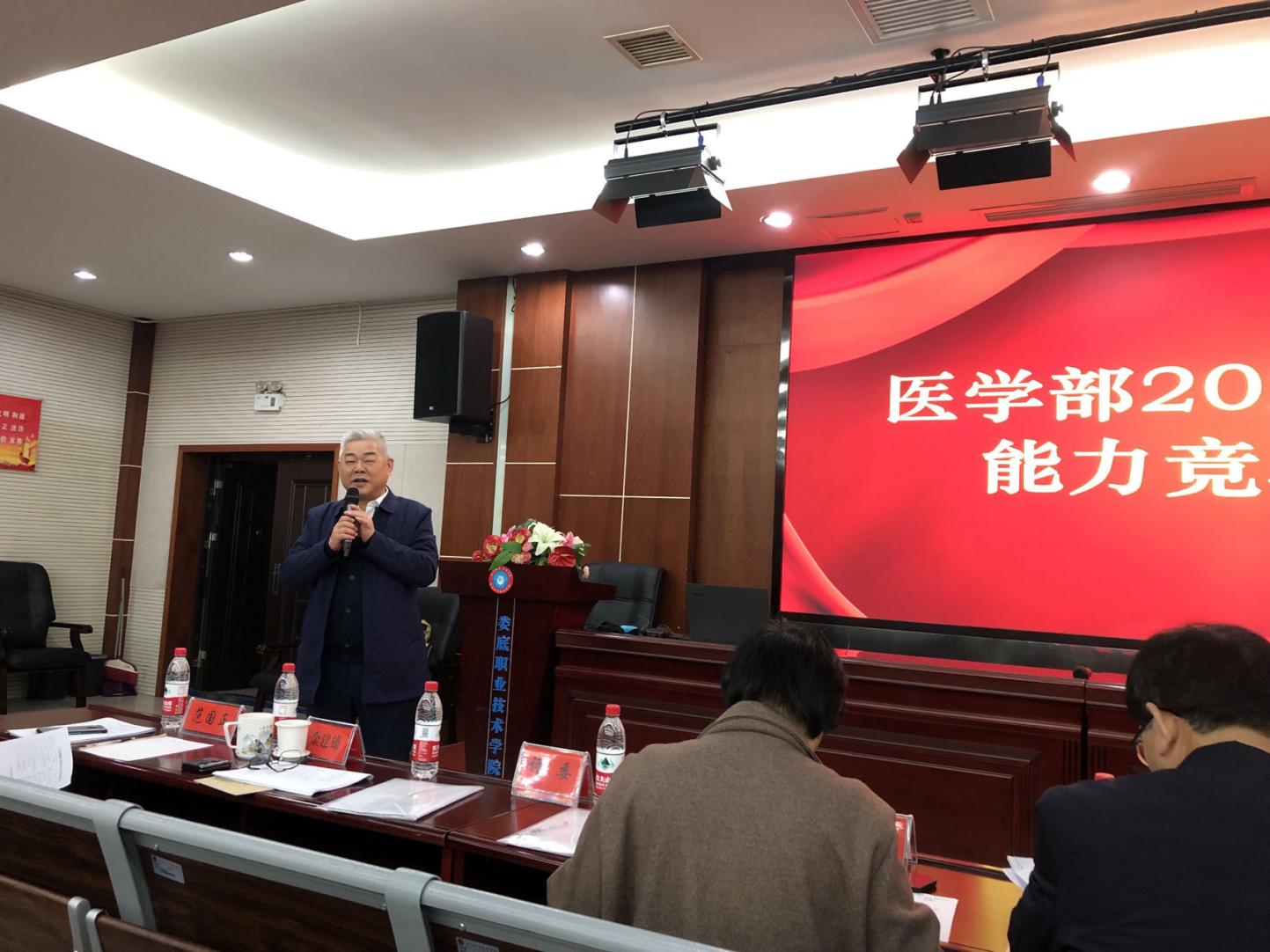金建雄在赛前发表讲话,教师职业能力竞赛是对参赛教师教学能力和教学水平的一次全面展示和检阅,希望各团队成员精诚协作,充分展现学科特色、优势和团队水平;青年教师要珍惜此次学习机会、认真取经,提高自身的教学能力和教学水平,发扬前辈医卫人精神,扎实开展各项教育教学工作,为大国工匠的培育工作筑牢教育阵地。