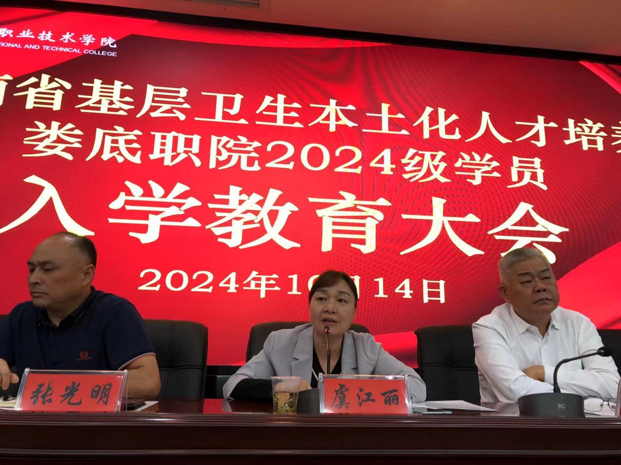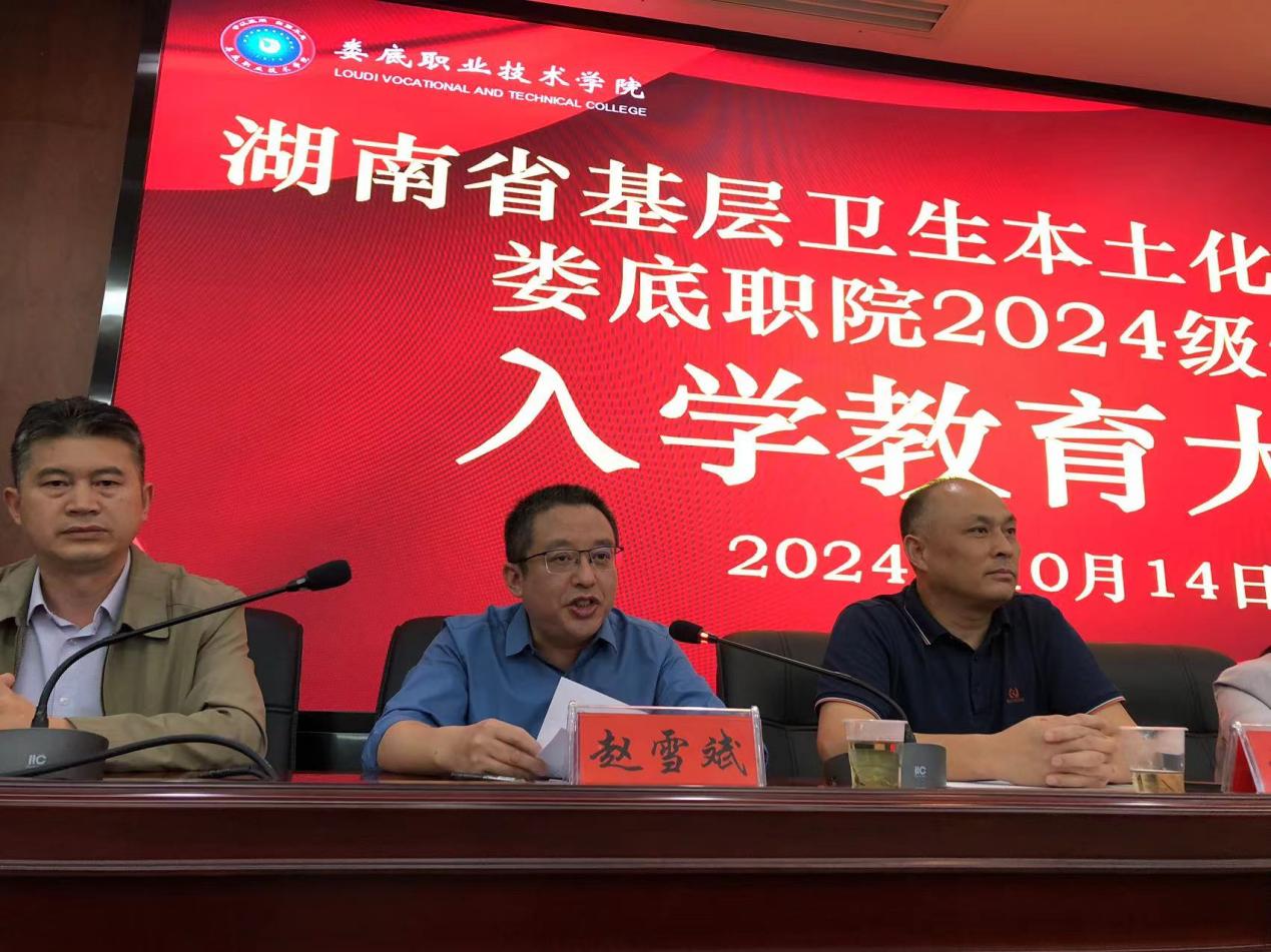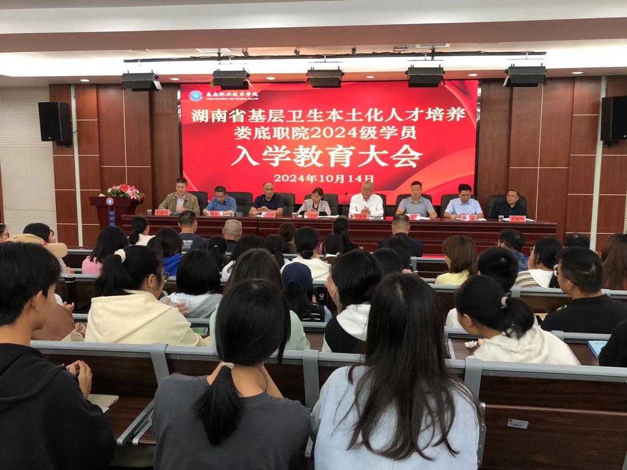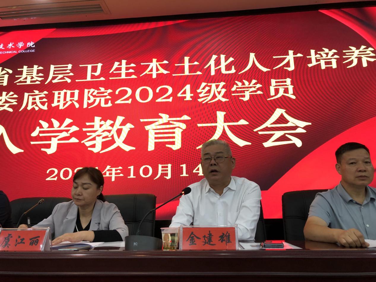 10月14日,湖南省基层卫生本土化人才培养娄底职院2024级学员的入学教育大会在医学部二楼学术报告厅举行。湖南省卫生健康委员会培训中心主任虞江丽、副主任张光明以及支委委员赵雪斌、娄底职业技术学院党委委员、副校长兼医学部主任金建雄、招生处处长李泉良、医学部常务副主任范国正、医学部党总支书记吴群雄,以及医学部教务科、学保科、临床医学院的负责人出席了会议。2024级本土化培养的临床医学和中医学两个班级的辅导员以及全体新生学员参加了此次培训,入学教育由范国正主持。