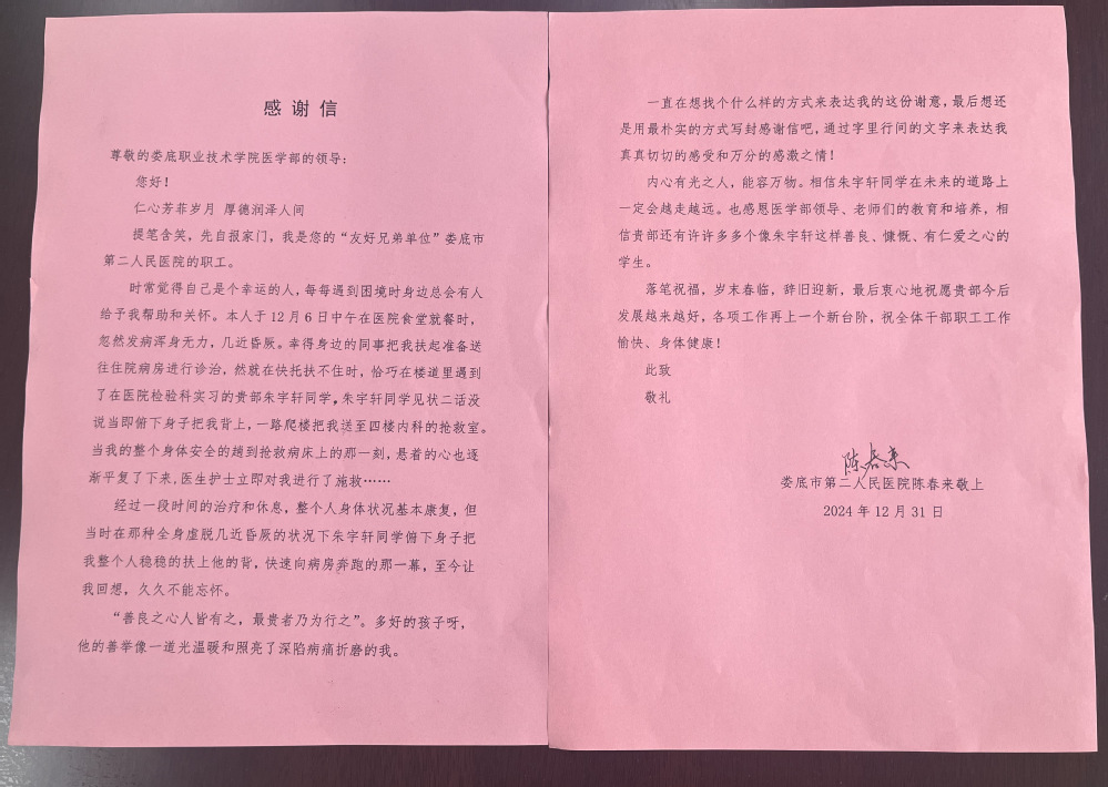 1月3日,陈春来和医院护理部主任周海燕专程来到学校医学部,送来一封感谢信,医学部党总支书记吴群雄、医院工作科、学保科、基础医学院负责人及朱宇轩同学所在班级辅导员在医学部小会议室接待了来访的市二医院领导。在双方交流中,陈春来几度哽咽讲到:“在我危难之际,朱宇轩同学毫不犹豫的挺身而出,将我快速而又稳稳地背向病房,让我得到了及时医治。我希望他的善行能够被更多人知晓,激励更多人在他人需要帮助时伸出援手,再次感谢贵校培育的优秀学生。他的行为不仅体现了医学生的专业素养和大爱无疆,更是展现了对社会的责任感和对生命的尊重。”