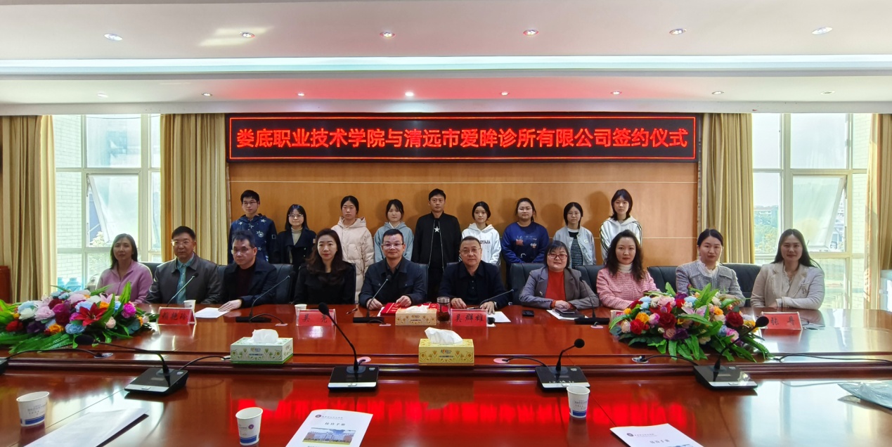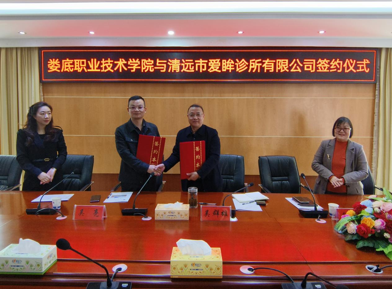 3月20日,娄底职业技术学院与清远市爱眸诊所有限公司在医学校区举行签约仪式,医学部党总支书记吴群雄、清远市爱眸诊所有限公司董事长吴亮、行政经理赖艳玲、行政主管王琴、医学部副主任曾芍、医学部副主任张丹及临床学院相关领导、医院工作科全体成员、教师代表、学生代表及家长代表出席签约仪式,曾芍主持。