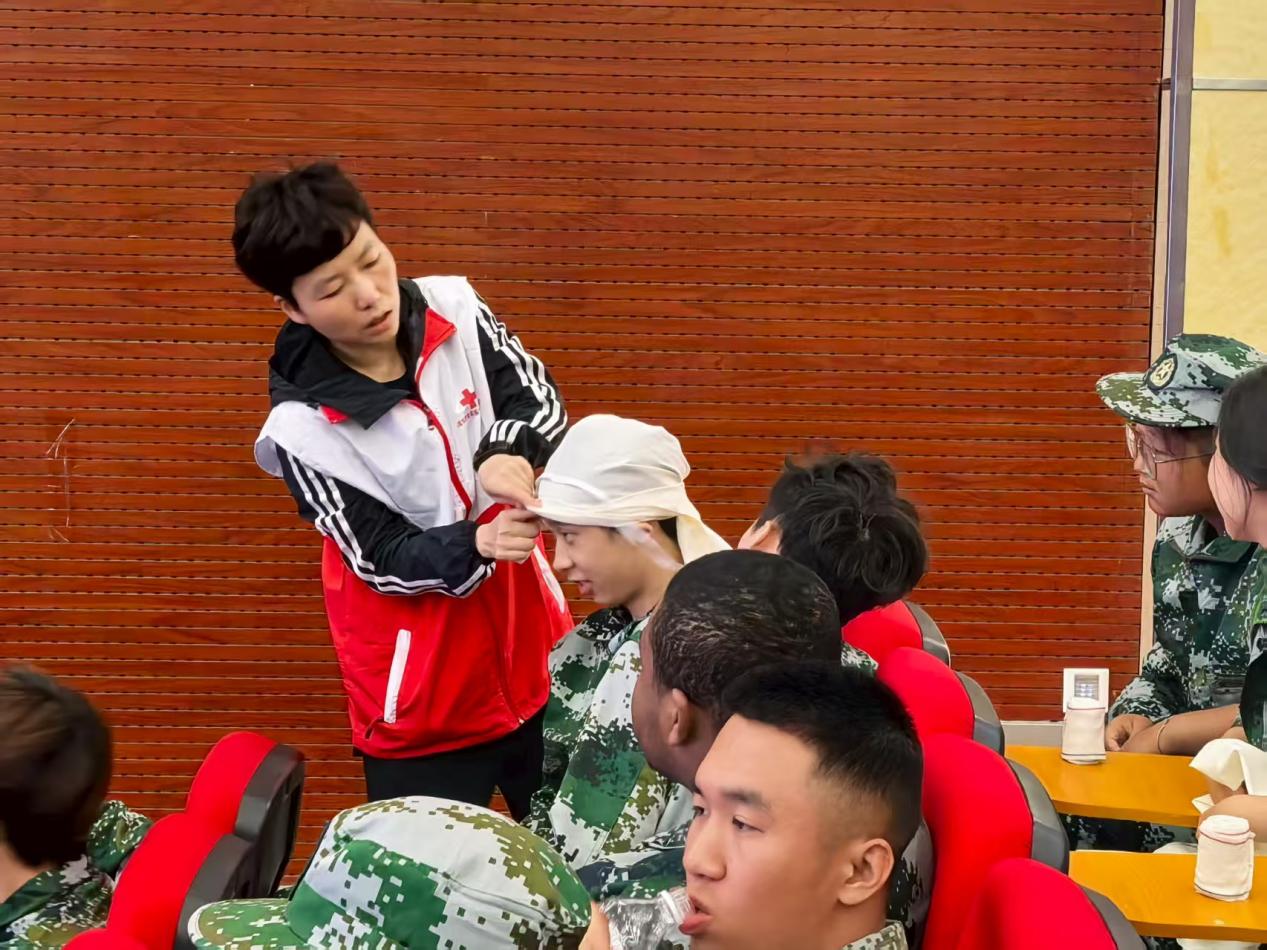 现场学习氛围十分热烈,大家都全身心投入到实操中。有的学员为了确保包扎手法标准,反复向培训师请教。“一开始觉得三角巾包扎很难,总担心会弄疼‘伤者’,但练了几次后就熟练了,现在能在不到2分钟内完成头部包扎。”机电工程专业学生王同学笑着展示自己的成果。