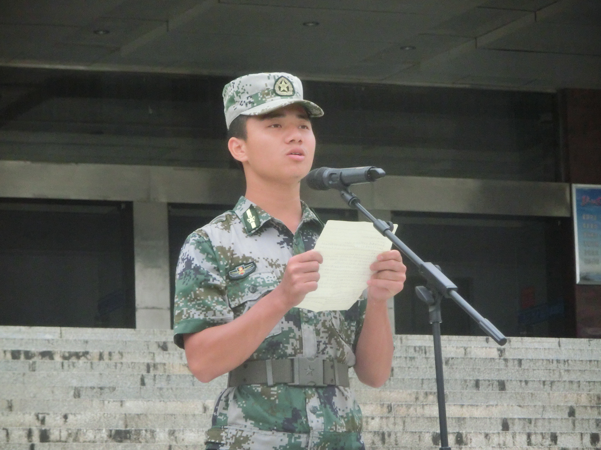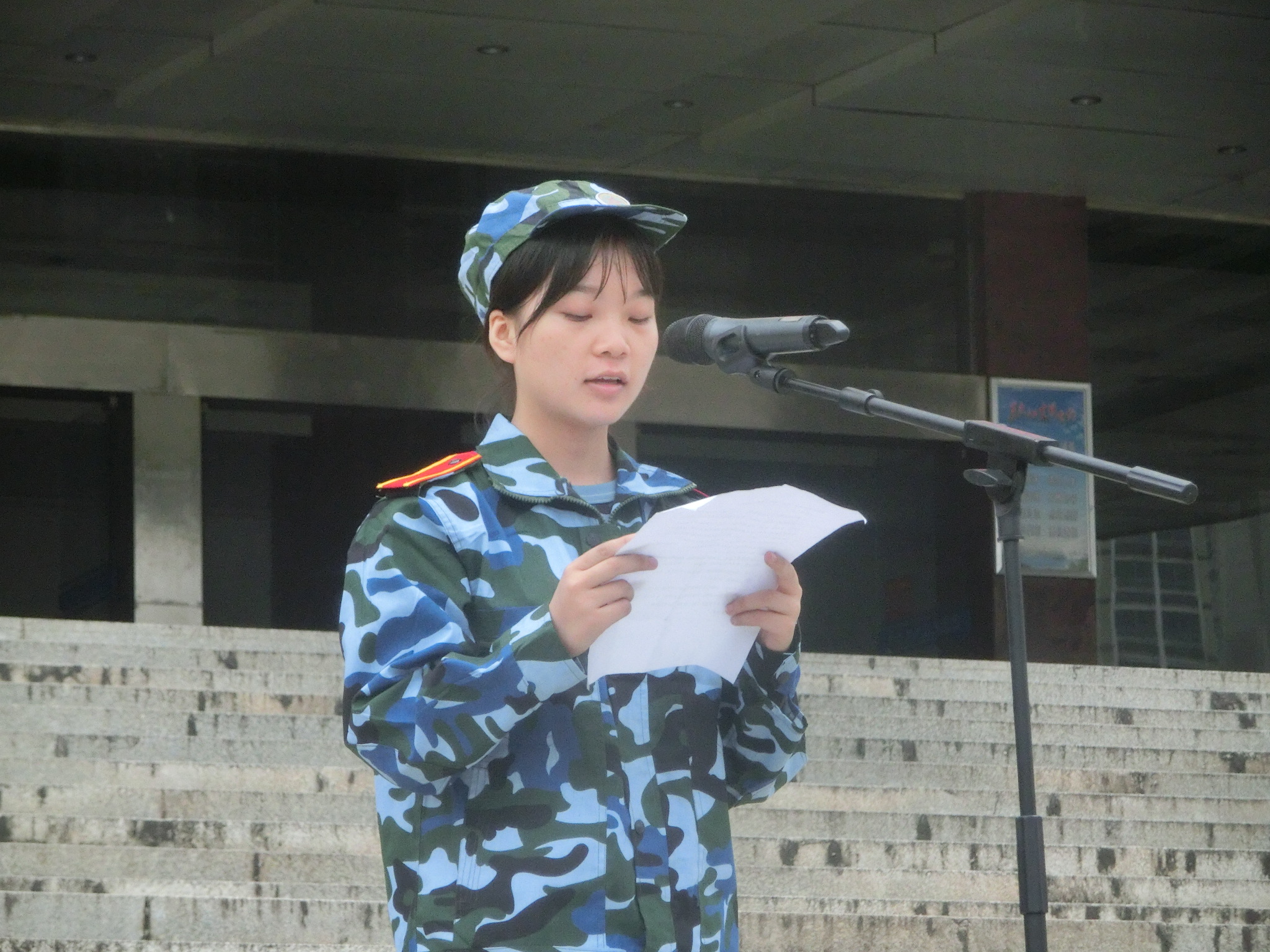 军训总教官邬迎春说明军训计划并安排各教官入连队,17级会计中职一班罗琴作为学生代表表态发言。