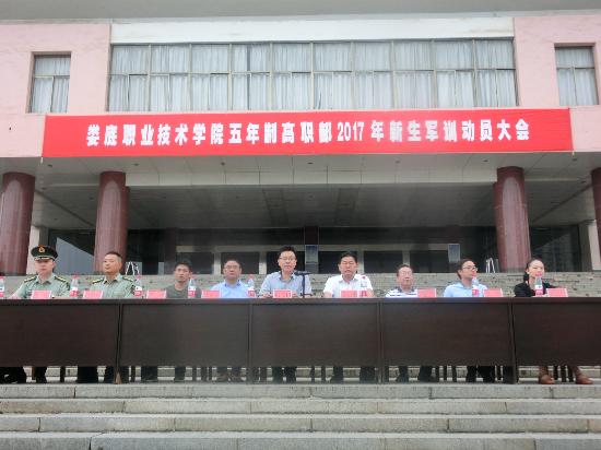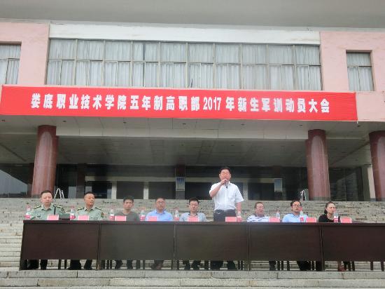 9月1日上午,我院五年制高职部2017级新生军训动员大会在主教学楼前举行,娄底职业技术学院校党委委员副校长金建雄、校党委委员副校长周志和、学工处处长李规、五年制高职部主任邱正文、党总支书记谢新茂、副主任廖学辉、李志强、谢跃辉,军训总教官邬迎春出席大会,大会由武装部部长张明主持。